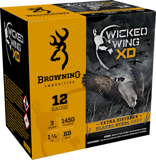 Browning Wicked Wing XD shotshells are designed for waterfowl hunting with steel shot in 12 gauge, 3" magnum loads. Each round contains 1 1/4 oz of #4 steel shot and delivers 1450 fps muzzle velocity for extended range performance on ducks and geese.