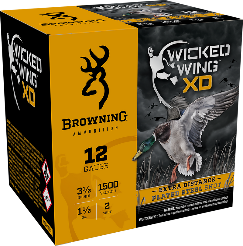 Browning Wicked Wing XD ammunition in 12 Gauge 3.50" magnum features 1 1/2 ounces of #2 steel shot designed for waterfowl hunting at extended distances. This steel shotshell load achieves a muzzle velocity of 1500 fps and is optimized for hunting applications.