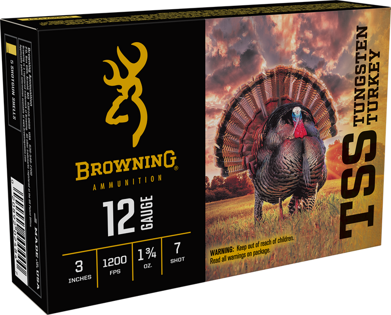 Browning TSS Tungsten Turkey shotshells are designed specifically for turkey hunting with 12 gauge 3" chambers. Loaded with 1 3/4oz of tungsten #7 shot and designed to deliver maximum density and penetration at typical turkey hunting distances, these shells achieve a muzzle velocity of 1200 fps.
