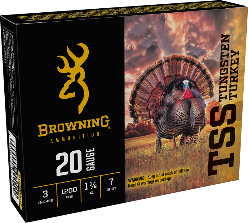Browning TSS Tungsten Turkey ammunition in 20 Gauge with 3" shells loaded with 1 1/2 oz of tungsten #7 shot, designed specifically for turkey hunting. This non-toxic tungsten load delivers 1200 fps muzzle velocity and provides superior density compared to traditional lead shot for effective range and pattern performance. Sold in boxes of 5 rounds.
