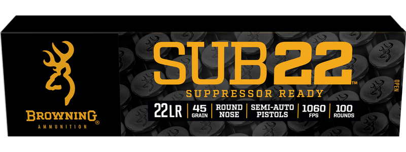 Browning Sub22 .22 LR ammunition features 45-grain round nose bullets designed for range shooting and small game hunting. With a muzzle velocity of 1060 fps and 100 ft-lbs of energy, this rimfire ammo delivers reliable performance in a 100-round box.