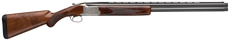 The Browning Citori White Lightning is a break-action over/under shotgun chambered in 12 Gauge with a 28" polished blued vent rib barrel and 3" chamber. Features an engraved silver nitride steel receiver, Grade III/IV oiled black walnut stock, single selective trigger, and includes three Invector-Plus extended chokes (F, M, IC). Weighs 8.2 lbs with an overall length of 45-46" and fixed ivory bead front sight with mid-bead rear.