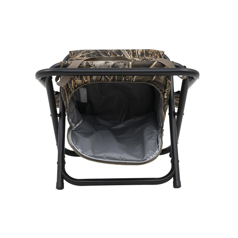 This extra-wide shooting chair features a powder-coated steel frame with a 22" W x 13.5" D x 33" H seat and supports up to 275 lbs. Built-in insulated cooler underneath keeps beverages and food cool during extended outdoor sessions. USA-made with a limited lifetime manufacturer warranty.
