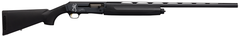 The Browning Silver Field is a 12 Gauge semi-automatic shotgun with a 28" back-bored ventilated rib barrel and 4+1 round capacity, chambered for 3.5" shells. It features an aluminum alloy receiver with two-tone black and charcoal finish, semi-humpback design, and a black synthetic composite stock with textured gripping surfaces. The gas-operated Active Valve System reliably cycles a wide range of loads, and it includes three Invector-Plus choke tubes (F, M, IC) with a brass bead front sight.