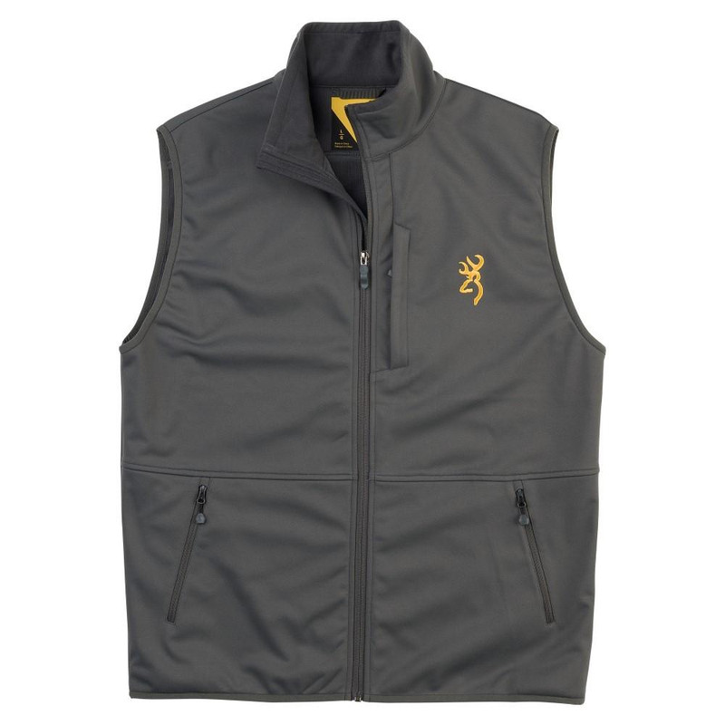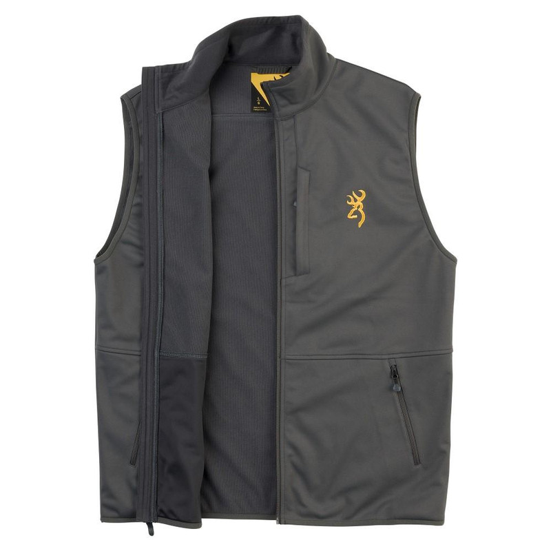 The Browning Soft Shell Vest features a windproof and highly water-resistant outer shell with micro-check fleece lining for effective heat retention. It includes a full front zipper, extra tall collar with beard guard, and stretchy quiet fabric suitable for layering or as an outer layer. Size Large.