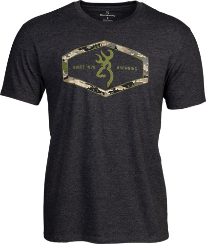 A Browning branded short-sleeve t-shirt featuring the Hexlock design in dark gray. This casual apparel is sized XL and suitable for everyday wear or outdoor activities.