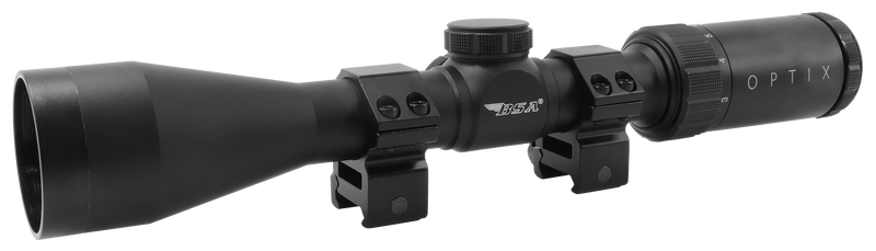 The BSA Optix 3-9x40mm rifle scope features a 1-inch aluminum tube with fully multi-coated optics and a BDC-8 reticle designed for hunting applications. It includes low-profile zero-reset turrets, fast focus eyepiece, and two-piece Weaver rings. The scope is fully waterproof, fogproof, and shockproof with 3.7-4 inches of eye relief and 100-yard parallax adjustment.