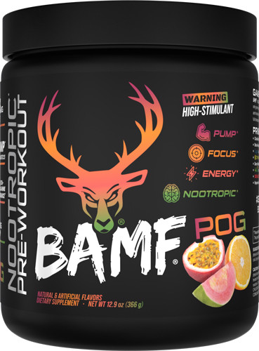 Bucked Up BAMF is a pre-workout supplement powder formulated to support energy, focus, and endurance during intense physical training. This POG (Passion Orange Guava) flavored product provides 30 servings per container. Pre-workout supplements are commonly used by athletes and fitness enthusiasts to enhance workout performance.