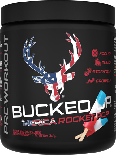 Bucked Up pre-workout supplement in Rocket Pop flavor provides 30 servings per container. Designed to support energy and performance during workouts.