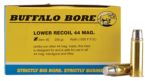 Buffalo Bore 44 S&W Special ammunition loaded with 255-grain hard cast semi-wadcutter bullets at 1000 fps muzzle velocity, delivering 566 ft-lbs of energy. Designed for personal protection and target use, this ammunition features brass casings and comes in 20-round boxes with 12 boxes per case.