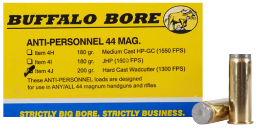 Buffalo Bore 44 S&W Special ammunition loaded with 200-grain hard cast wadcutter bullets designed for personal protection and home defense. This round delivers 1000 fps muzzle velocity and 440 ft-lbs of energy, packaged in brass cases with 20 rounds per box.
