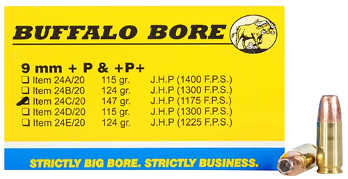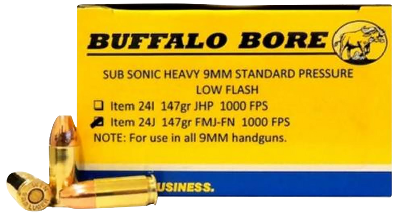 Buffalo Bore Ammunition Subsonic Strictly Business 9mm Luger 147gr Full Metal Jacket Flat Nose Handgun Ammo, 20 Round Box - 24J20