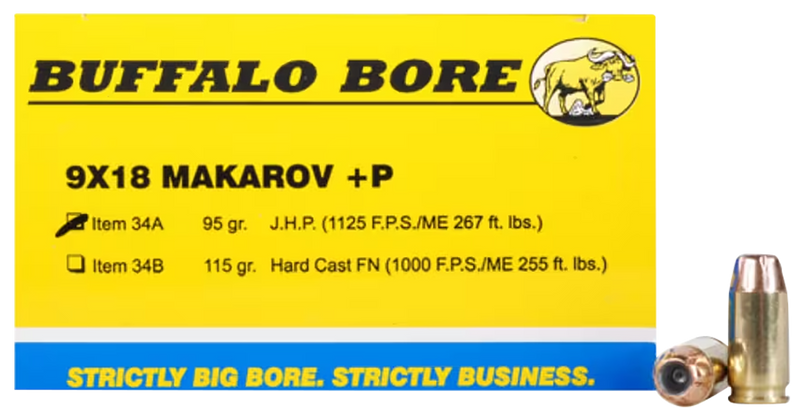 Buffalo Bore Personal Defense Strictly Business ammunition in 9x18 Makarov +P with 95 grain jacketed hollow point bullets. Delivers 1125 fps muzzle velocity and 267 ft-lbs of energy, suitable for personal protection and home defense applications. Sold as 20 rounds per box.