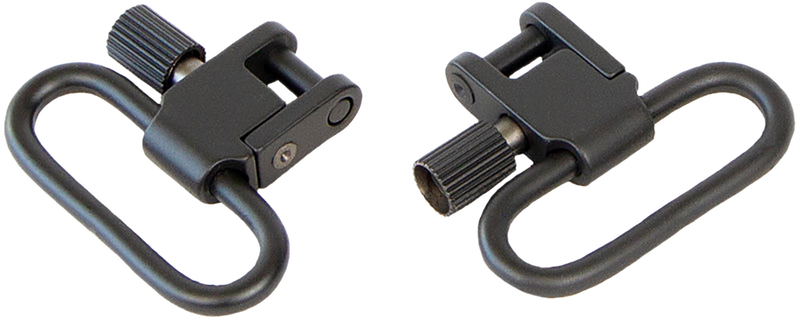 This Bulldog deluxe locking swivel set features 1.25" loops constructed from steel for secure attachment to firearms and accessories. The black finish swivels provide reliable rotation and locking capability, measuring 5.2" in length with a 3.3" width.
