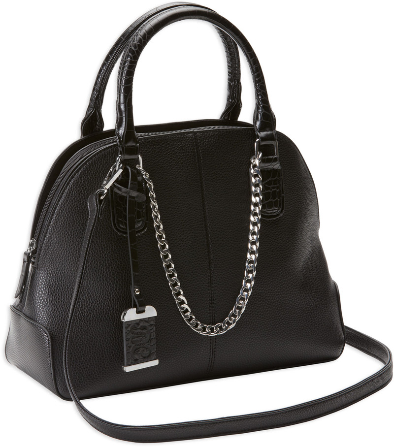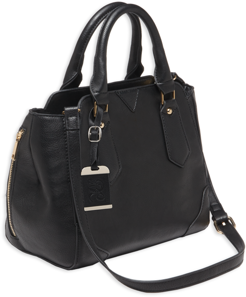 Black leather satchel purse with integrated holster designed for most small pistols and revolvers with ambidextrous hand compatibility. Features 2 compartments and measures 16.9" L x 11.0" W x 4.0" H. Constructed from leather with a concealed carry design suitable for everyday use.