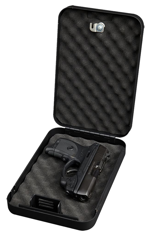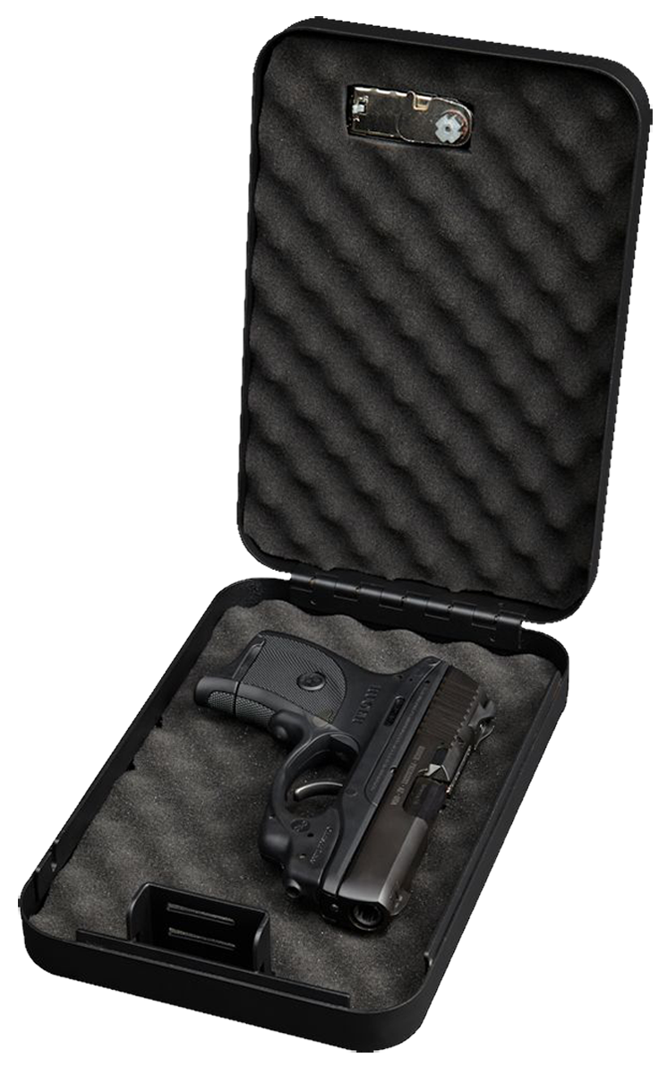 The Bulldog BD1126 is a compact personal safe designed to secure one handgun or valuables, measuring 9.5" x 6.5" x 2" with a black powder coat steel construction. It features a 3-wheel combination lock and includes a heavy-duty security cable, with interior egg crate foam to keep contents secure and in place. The safe meets TSA firearm guidelines for travel and includes a unique hinge design that holds the top lid in the open position.