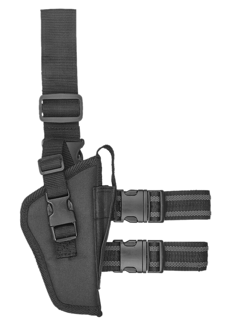 Right-hand leg holster designed to fit revolvers and small frame handguns with 2-4" barrels. Features a belt loop mount system and black synthetic construction. Dimensions: 17.8" L x 9.1" W x 4.9" H.