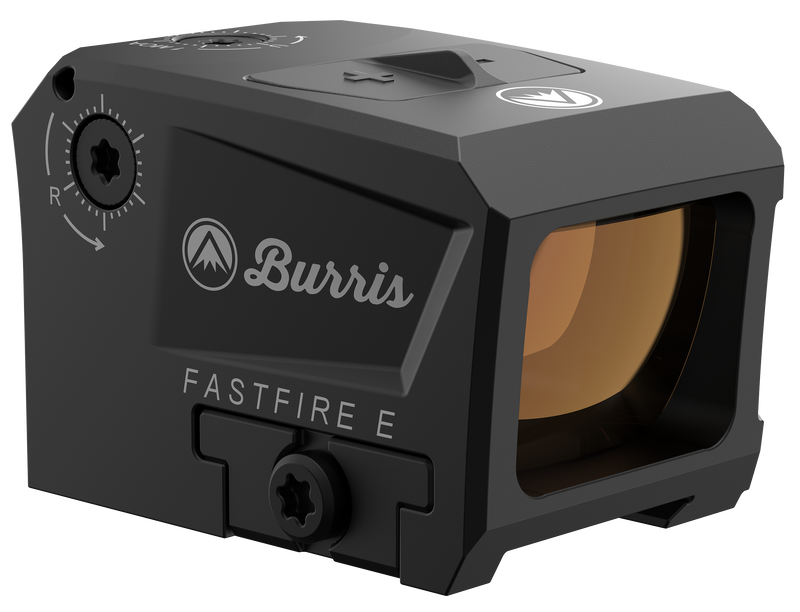 The Burris FastFire E is a 1x magnification reflex sight with a 3.5 MOA red dot reticle designed for pistols, shotguns, and carbines. Built from machined aluminum with a fully enclosed emitter, it features eight brightness settings (two night vision compatible), unlimited eye relief, and is waterproof, shockproof, and fogproof. The illuminated reticle is powered by a CR2032 battery with a 60,000-hour lifespan and includes 1 MOA windage/elevation adjustments with 100 MOA total adjustment range.
