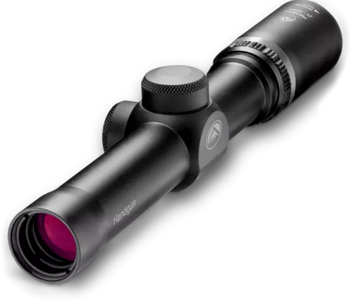 This 2x20mm handgun scope features a 1-inch tube with Plex reticle and matte black finish designed for handgun hunters. It offers long eye relief (10-24 inches) in a lightweight 7 oz package with multi-coated optics for enhanced clarity in low-light conditions. The scope includes 1/2 MOA windage and elevation adjustments with 80 inches of total adjustment range per axis.