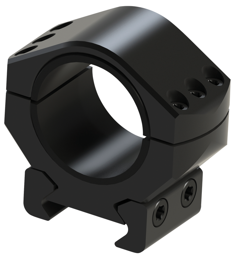 Two-piece scope ring set designed for tactical shooters, featuring 30mm tube diameter and 1" mounting height for Picatinny/Weaver rails. Self-centering dual steel clamps with Pos-Align Insert technology provide precise scope centering and maximum holding power while protecting scope finish.