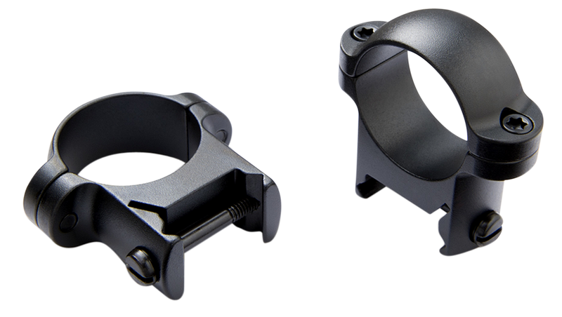 These solid steel Weaver-style scope rings are designed to securely hold 1-inch tube diameter scopes on any Weaver-compatible base. The low-profile rings are machined to exact tolerances with matched top and bottom components to ensure strength and stability, capable of handling recoil from any rifle.