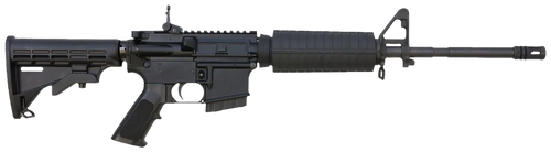 Semi-automatic rifle chambered in 5.56x45mm NATO with a 16" barrel and 10+1 capacity. Features a mil-spec trigger, A2 flash hider, A2 front sight with carry handle rear sight, 6-position collapsible stock, and 7075-T6 aluminum receiver. Weighs 6.70 lbs with overall length ranging from 32.50" to 36" depending on stock position.