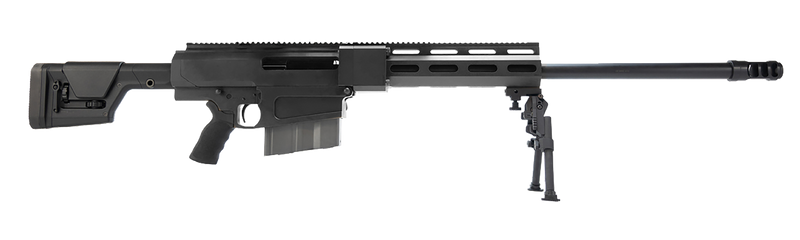 The Bushmaster BA50 is a bolt-action rifle chambered in 50 BMG with a 29" free-floating chrome-lined barrel and 10+1 capacity. It features an aircraft-grade aluminum receiver, Magpul PRS Gen3 adjustable stock, BFI target trigger, and comes with a 14" free-float handguard, GG&G tactical bipod, and hard case. Weighing 26.5 lbs with an overall length of 56.75", this rifle is optic-ready with Picatinny rails and includes improved bolt design for reliable extraction and feeding.