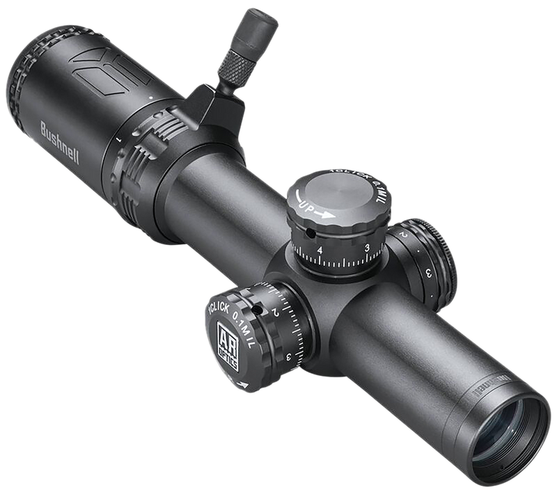 The Bushnell AR Optics 1-4x24mm riflescope features a 30mm tube with first focal plane (FFP) design and illuminated BTR-1 reticle optimized for tactical rifle applications. Fully multi-coated optics deliver bright, high-contrast images with 110 MOA windage and elevation adjustments. This waterproof scope weighs 18 oz, has 4 inches of eye relief, and includes a throw-down power change lever for quick magnification adjustment.