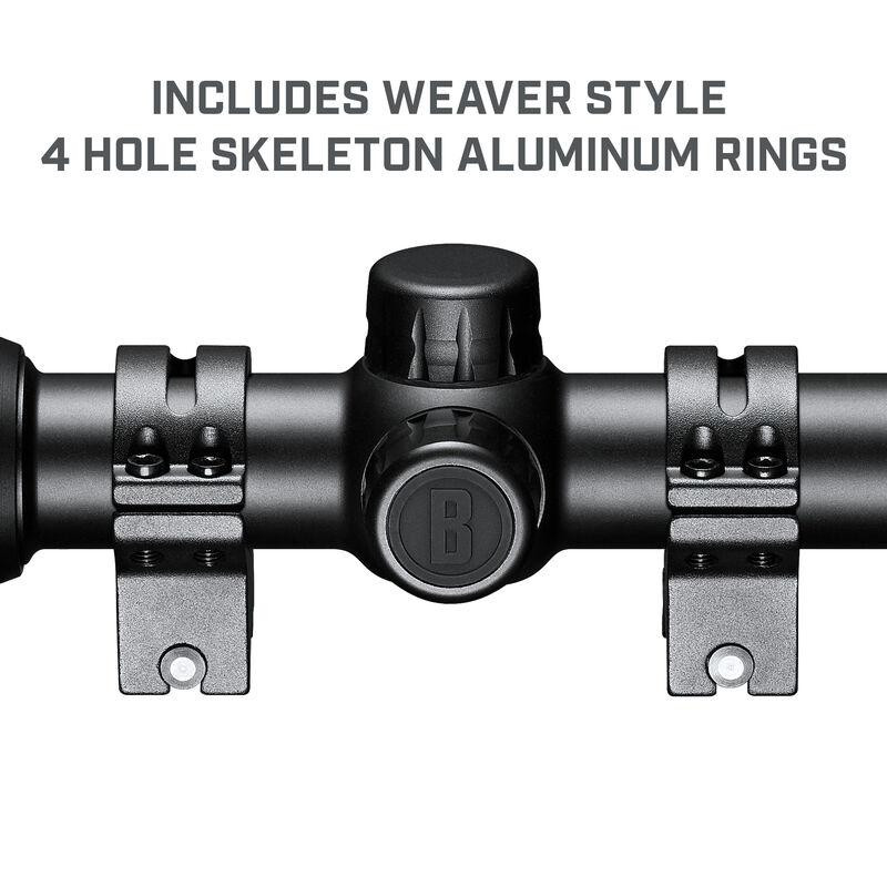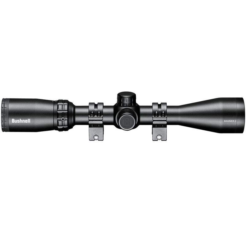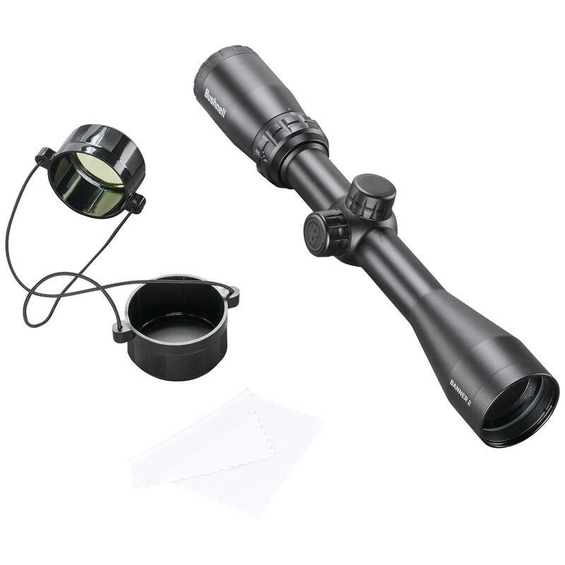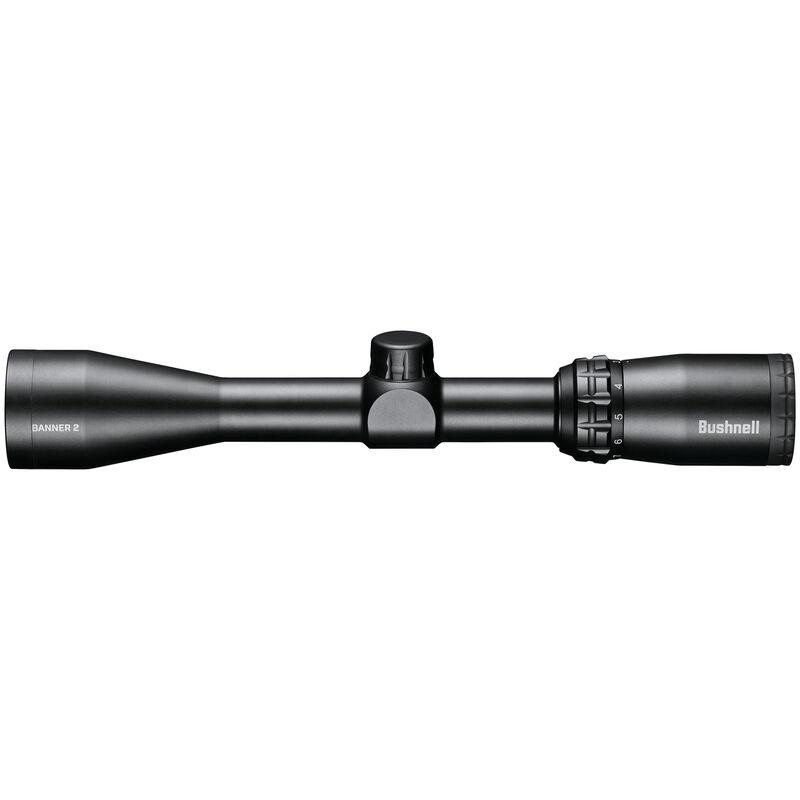 The Bushnell Banner 2 is a 3-9x40 variable power riflescope with 1-inch tube diameter and second focal plane (SFP) configuration, featuring a DOA Quick Ballistic reticle with 5 drop points and wind hold lines. It offers multicoated optics, 3.5" eye relief, fixed parallax at 100 yards, and IPX-7 waterproofing, weighing 14.8 oz. Includes Weaver-style aluminum rings for installation on Weaver and Picatinny rails.