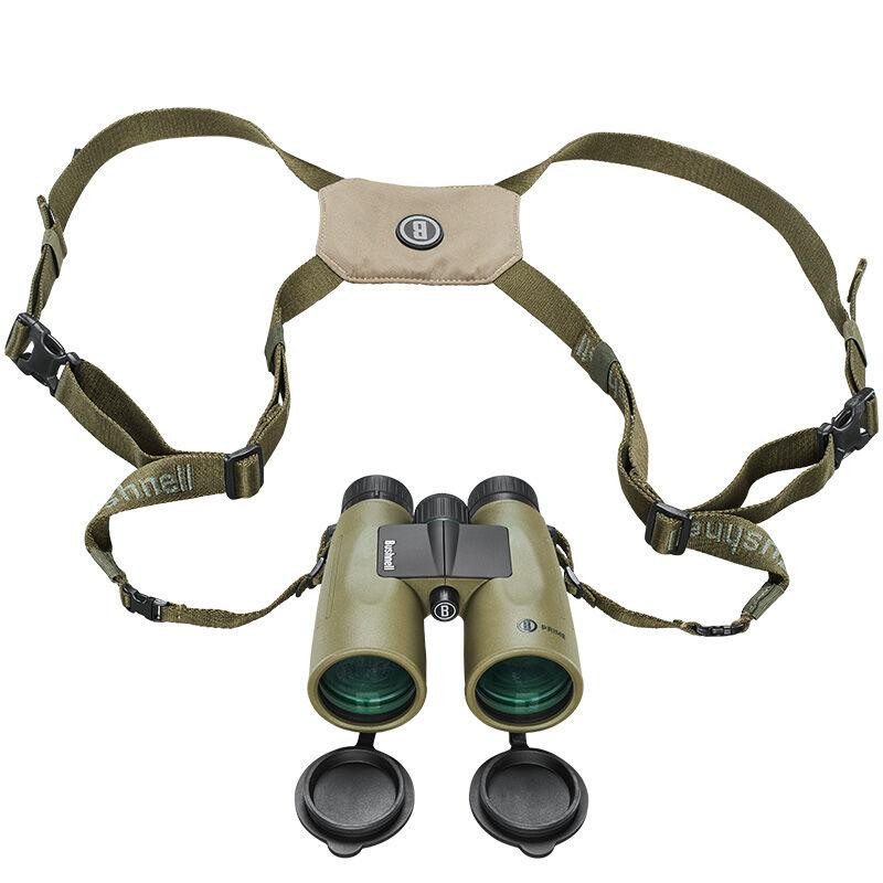 The Bushnell Prime 12x50 binocular features 12x magnification with a 50mm objective lens and roof prism design with BAK-4 glass for bright, clear images. This combo includes the Vault modular harness pack with magnetic closure, providing weather-resistant storage with IPX-7 waterproof rating. The binocular offers fully multi-coated optics, twist-up eyecups, 326 ft field of view at 1000 yards, and is tripod-adaptable.