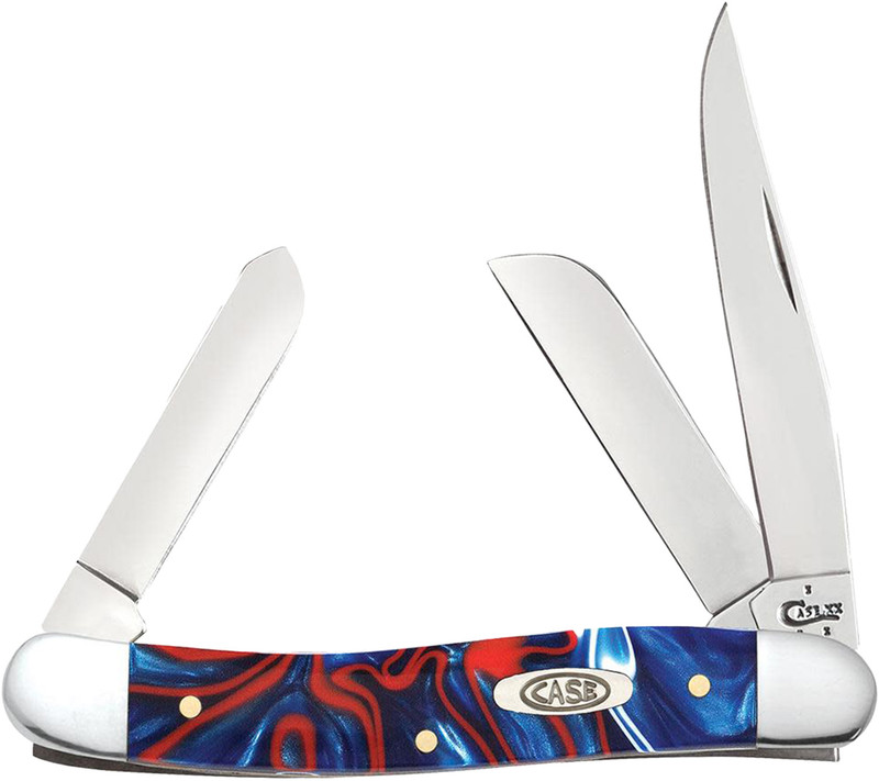 This Case Knives medium stockman folder features three blades: a 2.57" clip point, 1.88" sheepsfoot, and 1.7" pen blade, all crafted from Tru-Sharp surgical stainless steel. The handle is constructed from patriotic-colored Kirinite with an overall length of 6.2". Ideal for general cutting tasks and everyday carry.