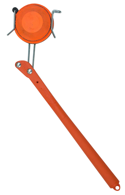 The Caldwell hand-held clay launcher is a manual cocking trap designed for clay and sport shooting practice. Features a single-arm design with manual trigger operation and holds standard clay targets. Constructed of green plastic for durability and easy field use.