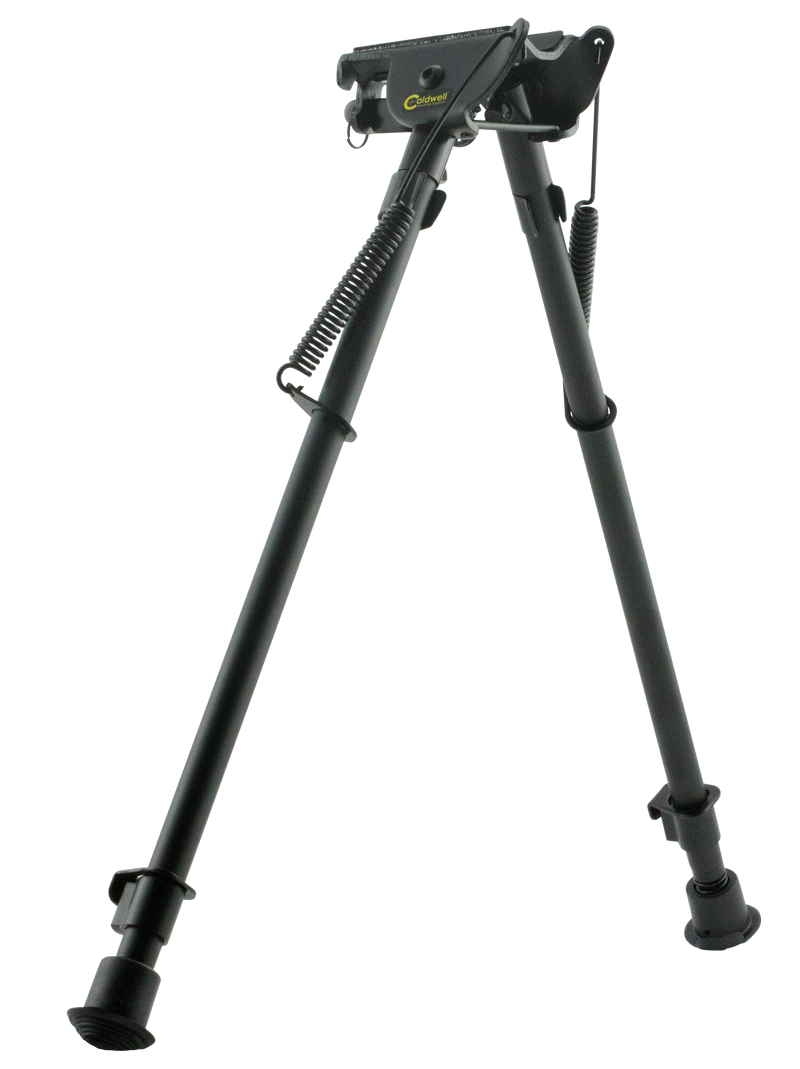 The Caldwell XLA is a lightweight aluminum fixed bipod with adjustable height from 13" to 23" that attaches via sling swivel stud. Features spring-loaded legs with notched indexing for quick deployment, padded cradle blocks, rubber feet, and forward-collapsing design for convenient carry. Weighs 14 oz and includes a sling attachment point.
