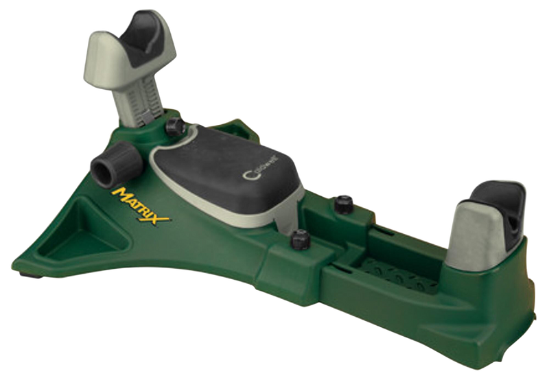 The Caldwell Matrix is an ultra-rigid 2-piece sliding frame shooting rest that adjusts to fit any rifle or handgun with an open central channel to accommodate detachable magazines and lever-action firearms. It features an innovative spring-loaded elevation system for fast, one-handed adjustment without wobble, and includes a storage compartment lid that doubles as a handgun base. The rest weighs 5 lbs and provides rock-solid stability for bench shooting and sight-in work.
