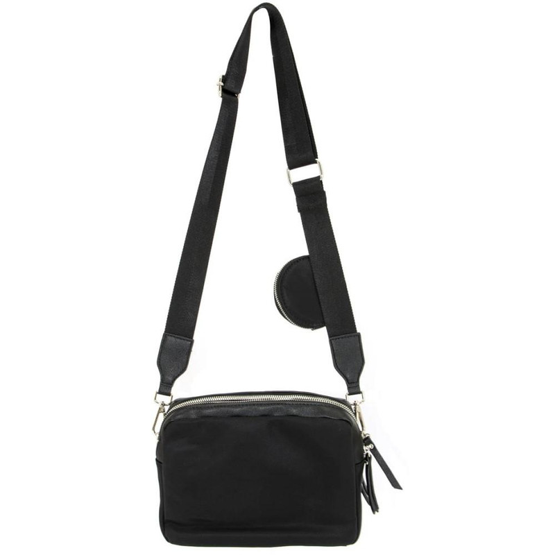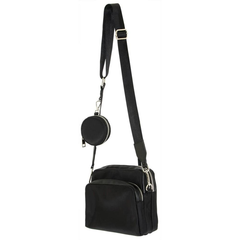 Water-resistant and stain-resistant nylon crossbody purse designed for everyday carry and commute use. Features dual main zippered compartments, detachable coin purse, and adjustable fabric shoulder strap with silver hardware. Dimensions: 7.5" x 9.5" x 4".