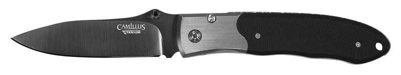 The Camillus Pristine is a 3" folding drop point knife featuring a VG-10 Carbonitride Titanium blade with a plain edge and black/silver G10 and stainless steel handle. With an overall length of 6.75" when closed, this compact knife is designed for general cutting tasks and outdoor use.