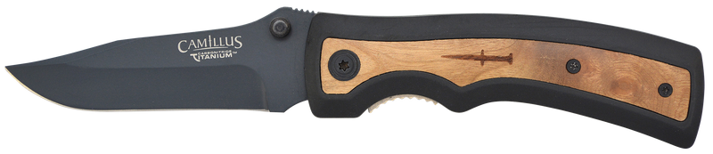 The Camillus Slick features a 3" AUS-8A stainless steel clip point blade with a plain edge and black carbonitride titanium coating for durability. The knife opens via thumb stud and includes a 5" black rubber and wood handle for a secure grip. Overall length is 8" when open, making it suitable for general cutting tasks and everyday carry.