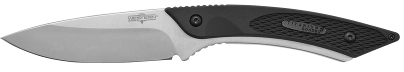 The Camillus Western Coil is a 3.25" fixed blade knife with a 420 stainless steel titanium-bonded blade and full tang construction. It features a black rubber and stainless steel handle for durability and grip, with an overall length of 8" and comes with a nylon sheath for carry and storage.