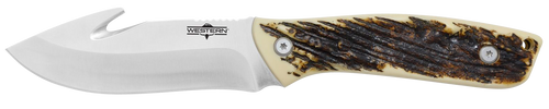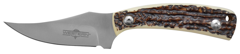 The Camillus Western Crosstrail features a 3.25" 420 stainless steel blade with titanium bonding and a plain edge for reliable cutting performance. The full tang construction with stag/antler Delrin handle provides durability and a classic aesthetic. Includes a belt loop sheath for convenient carry and storage.