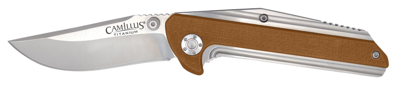 The Camillus Sevens is a 7-inch overall folding knife featuring a 2.75" AUS-8A stainless steel blade with a plain edge and carbonitride titanium coating. The Desert Tan G10 and stainless steel handle provides a durable grip for everyday carry and general cutting tasks.