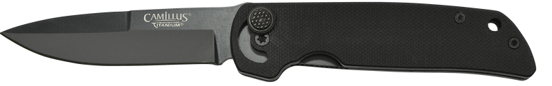 The Camillus Cuda Mini features a 3-inch AUS-8A stainless steel drop point blade with a plain edge and black carbonitride titanium coating. The knife includes a Quick Launch Bearing System for rapid deployment and is fitted with a black textured G10 handle. With an overall length of 6.75 inches, this compact folding knife is designed for everyday carry and general utility tasks.