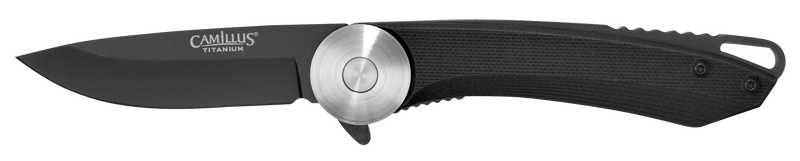 The Camillus Cirque is a 2.75" folding knife featuring an AUS-8A stainless steel drop point blade with a carbonitride titanium coating and black G10 handle. It includes a Quick Launch Bearing System for rapid blade deployment and has an overall length of 7" when open. This compact EDC knife is suitable for general cutting tasks and outdoor use.
