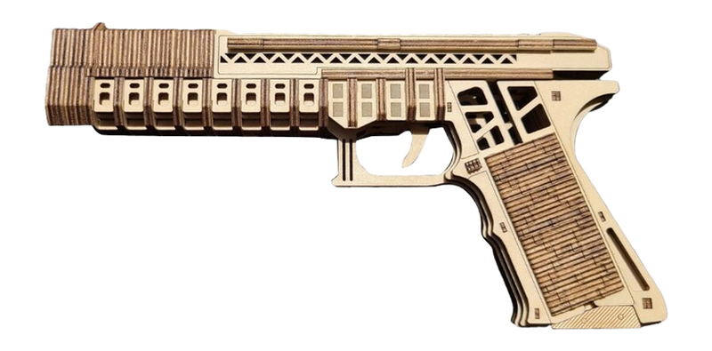 This is a 3D wooden puzzle designed in the shape of a Glock firearm. It serves as a novelty toy or decorative item for firearm enthusiasts. The puzzle requires assembly and is not a functional firearm or accessory.