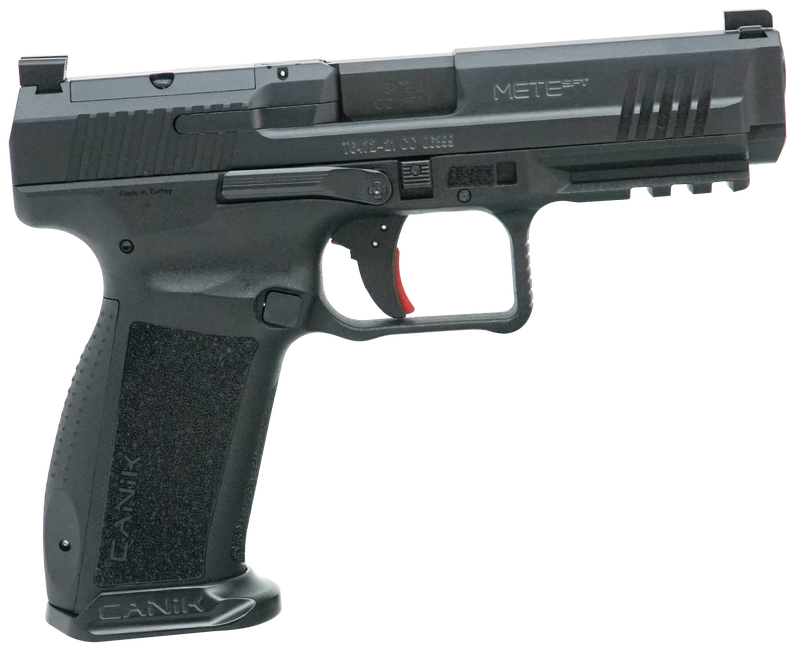 The Canik Mete SFT is a full-size striker-fired 9mm pistol with a 4.46" black match grade barrel and black nitride optic-ready serrated steel slide. The polymer frame features a Picatinny rail, ambidextrous controls, integrally flared mag-well, and undercut trigger guard. Ships with two magazines (18rd and 20rd) and includes optics mounting plates.