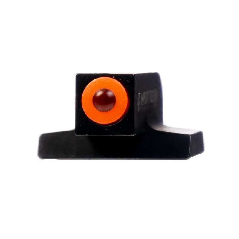 This tritium night sight set for the Canik METE MC9 features a front sight with orange focus element and blacked-out rear sight filled with Swiss tritium gas for low-light visibility without batteries or external light exposure. The rear sight includes an angled edge designed for emergency one-hand operation, and the sights are assembled in the USA with durable construction built to last.