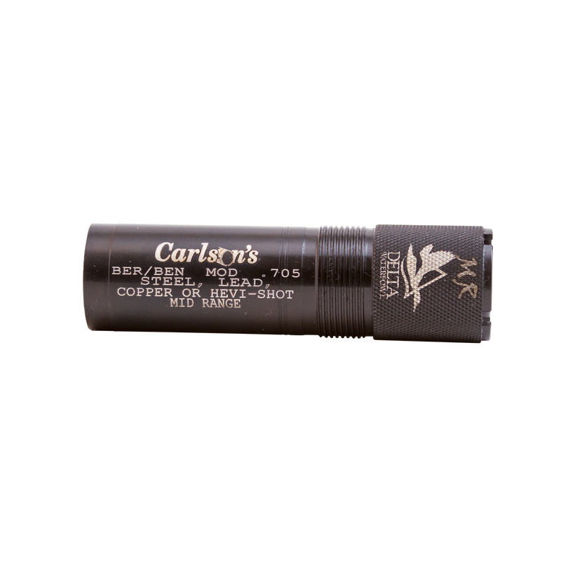 Carlsons Delta Waterfowl extended choke tube designed for 12 gauge Benelli and Beretta shotguns with mid-range constriction (.705" diameter). Manufactured from 17-4 stainless steel with black finish for corrosion resistance. Direct-thread installation compatible with Benelli/Beretta Mobil choke systems.