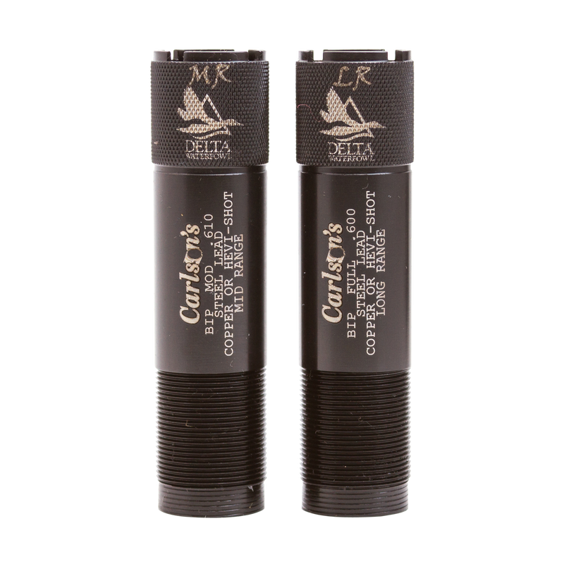 These Carlson's Delta Waterfowl Extended Choke Tubes are manufactured from 17-4 stainless steel and designed for Browning Invector-Plus 20 gauge shotguns. The extended design features a 25% longer parallel section to throw tighter, denser patterns for mid-range and long-range waterfowl hunting. The pack includes 2 choke tubes with knurled ends for easy removal and laser-marked constriction sizes.