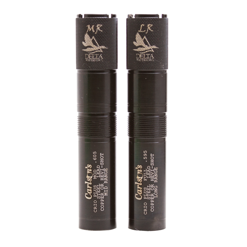 Carlson's Delta Waterfowl extended choke tube designed for Benelli Crio Plus shotguns in 20 gauge. Constructed from 17-4 stainless steel with black finish, this mid-range constriction choke is ideal for waterfowl hunting at mid to long range. Package includes 2 choke tubes with standard screw-in installation.