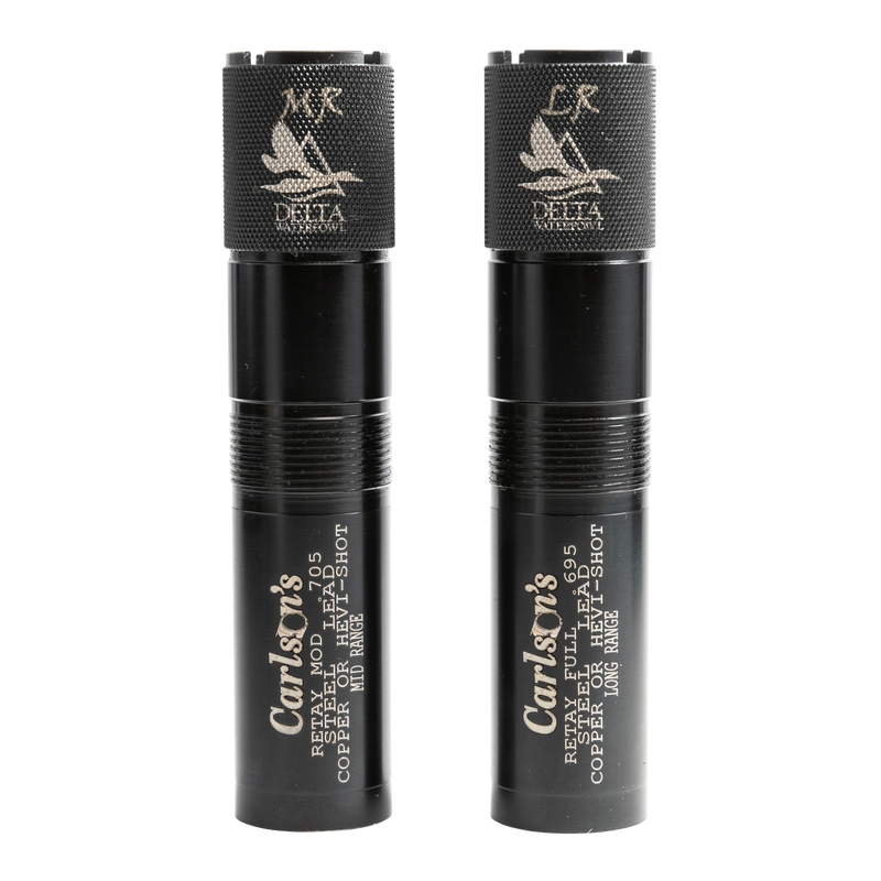Carlson's Delta Waterfowl choke tube for 12 gauge shotguns, designed for mid to long-range waterfowl hunting. Manufactured from 17-4 stainless steel for durability and corrosion resistance. This Retay-compatible tube comes as a set of 2 and measures 8.4" in length with a 1.5" width.