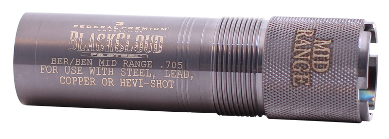 This is a titanium-coated steel choke tube designed for 12 gauge Beretta and Benelli shotguns with MobilChoke threading. The mid-range constriction (.705" diameter) is optimized for waterfowl hunting, particularly when paired with Federal Premium Black Cloud ammunition. The extended tube installs directly into compatible MobilChoke-threaded barrels without tools.